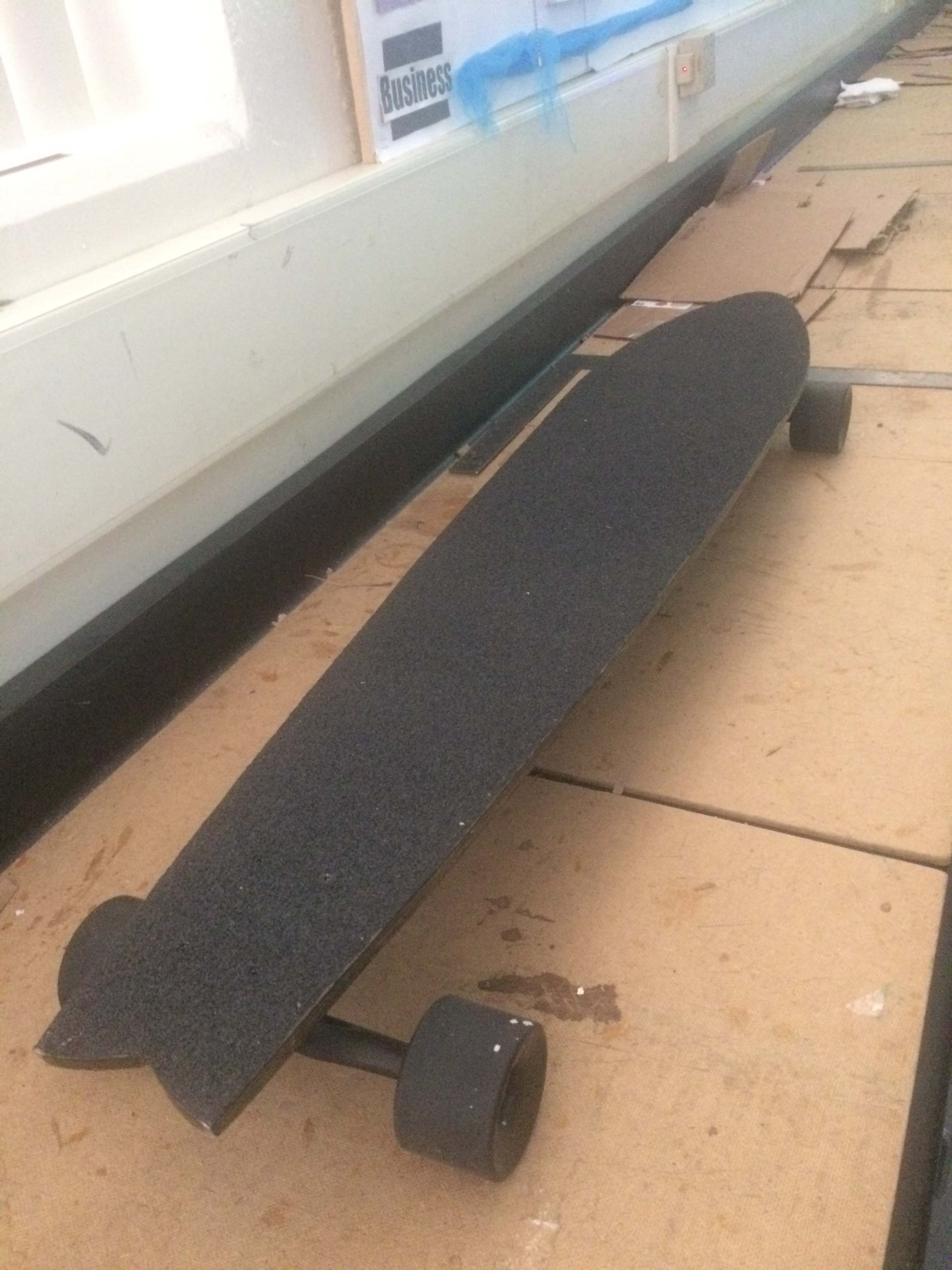 Today we finished gluing our "prototype" longboard. We essentially got 4 pieces of cardboard, and glued them on top of each other. It took almost the whole period, and it got quite messy. We had to distribute the glue evenly across the whole surface. It was fun, even though glue got stuck on my clothes.